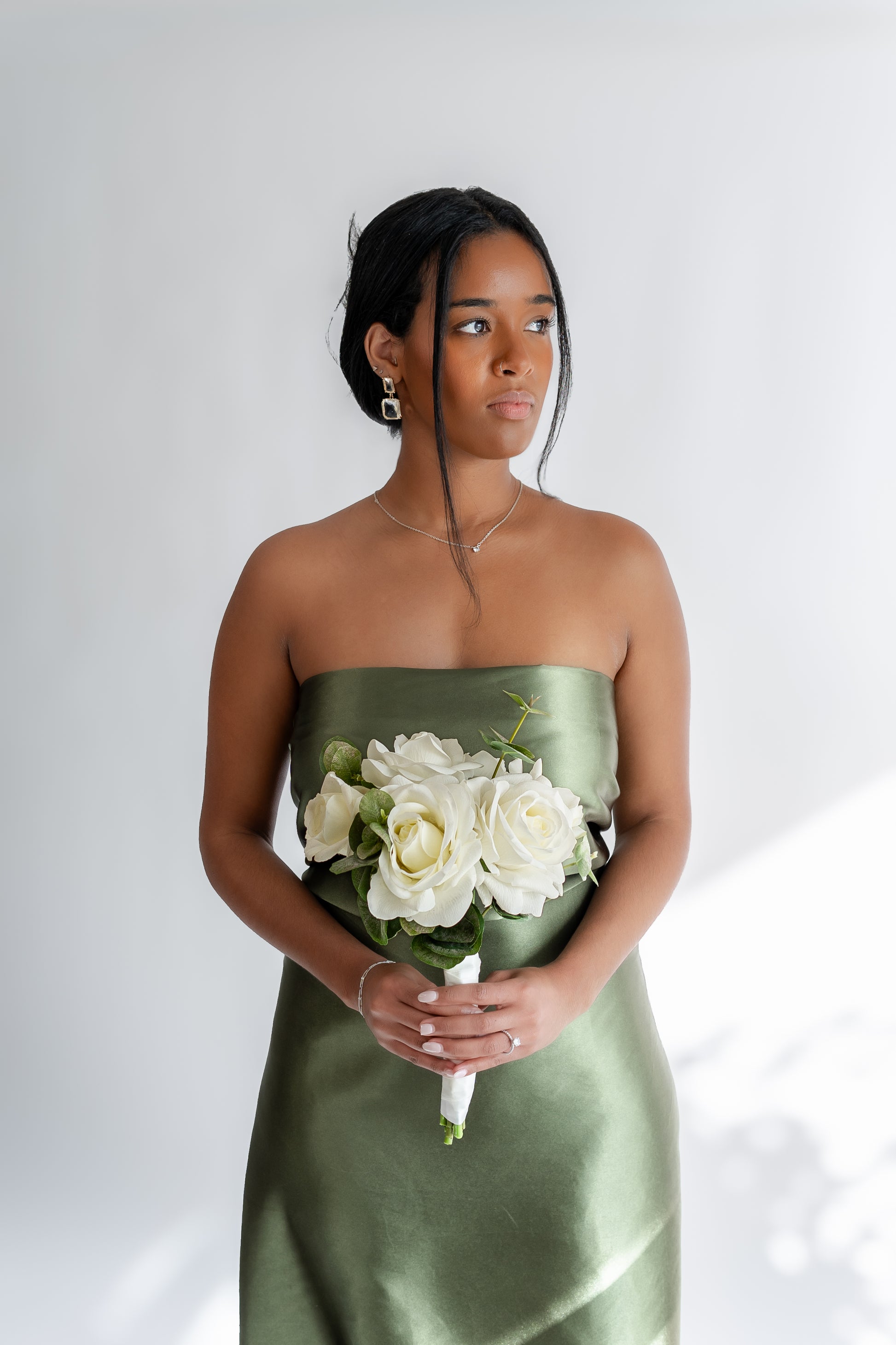 Callista White Real Touch Rose Bridesmaid Bouquet – Lifelike Faux Wedding Flowers